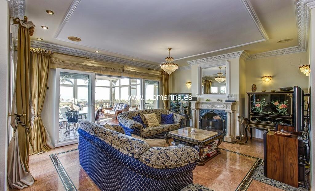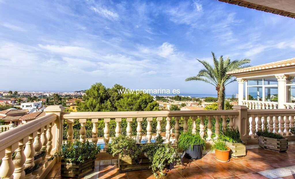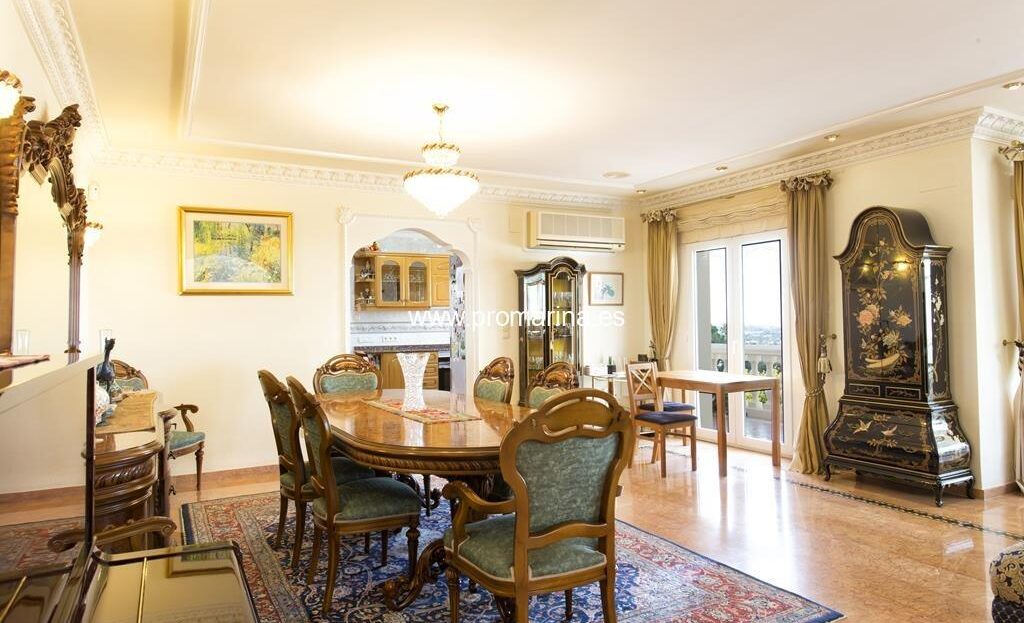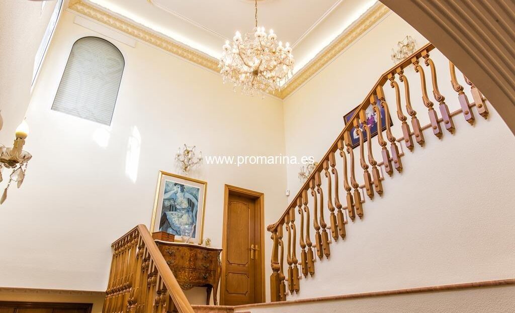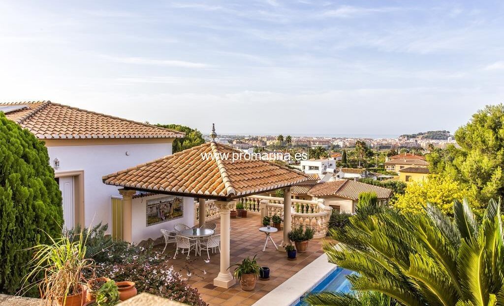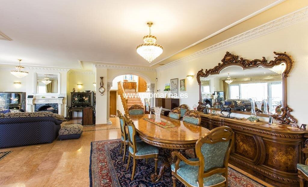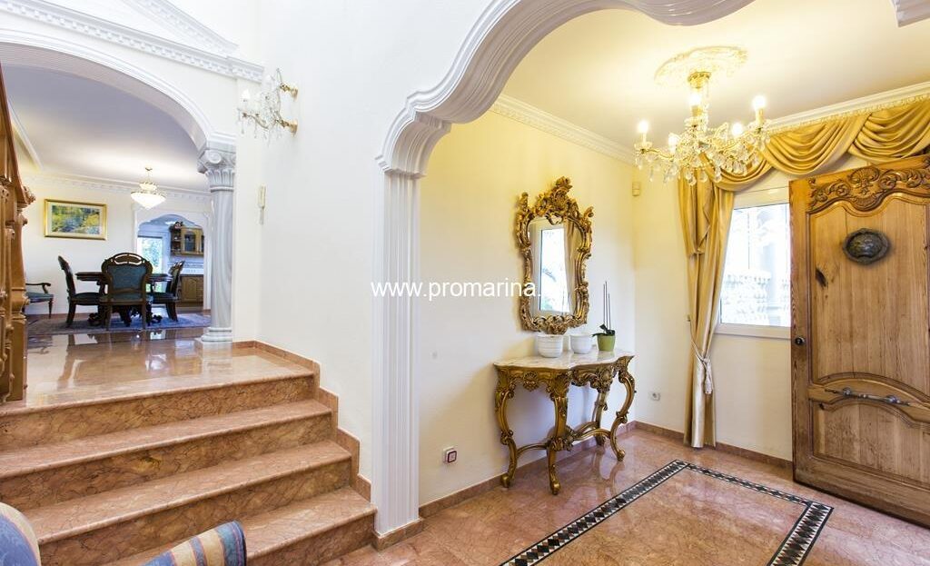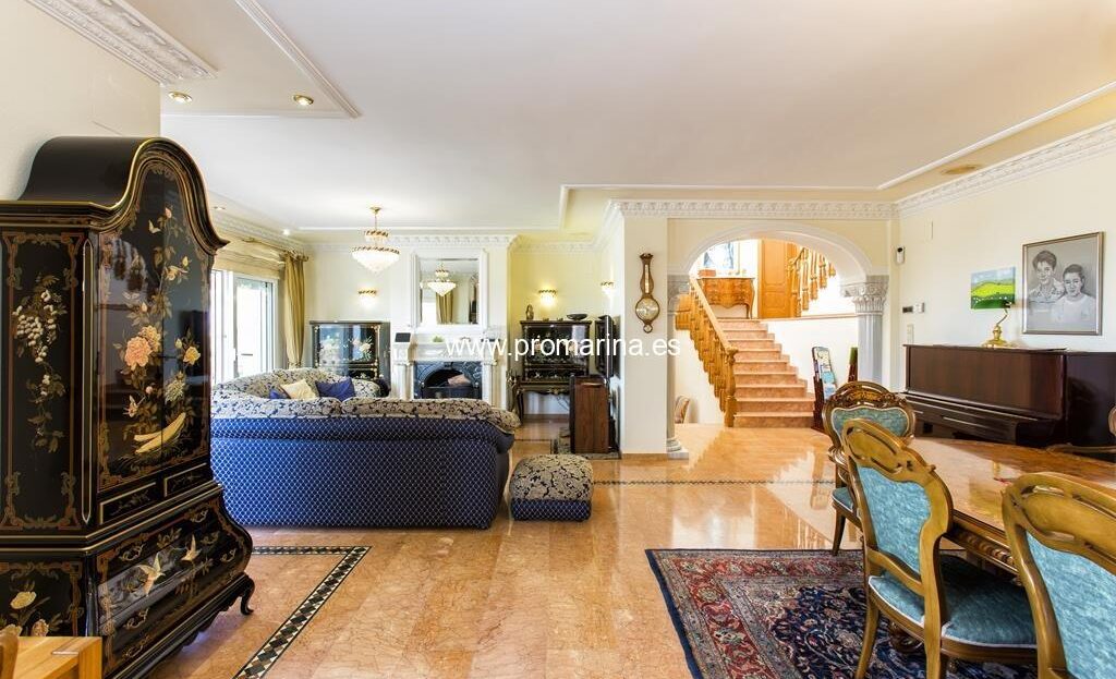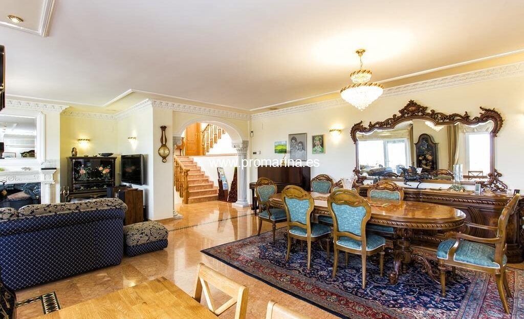 We present you this extraordinary luxury villa, located in an excellent area in Dénia, offering panoramic views of the sea and the city. With a constructed area of 628 m2 and a plot of 2.395 m2, this property is a perfect combination of elegance, comfort and privacy. The villa is distributed over three floors, providing ample and functional space for the whole family. Firstly, on the main floor, you will find an entrance hall, a guest toilet and a spacious living-dining room with a beautiful marble fireplace and large windows that connect to a glazed terrace.