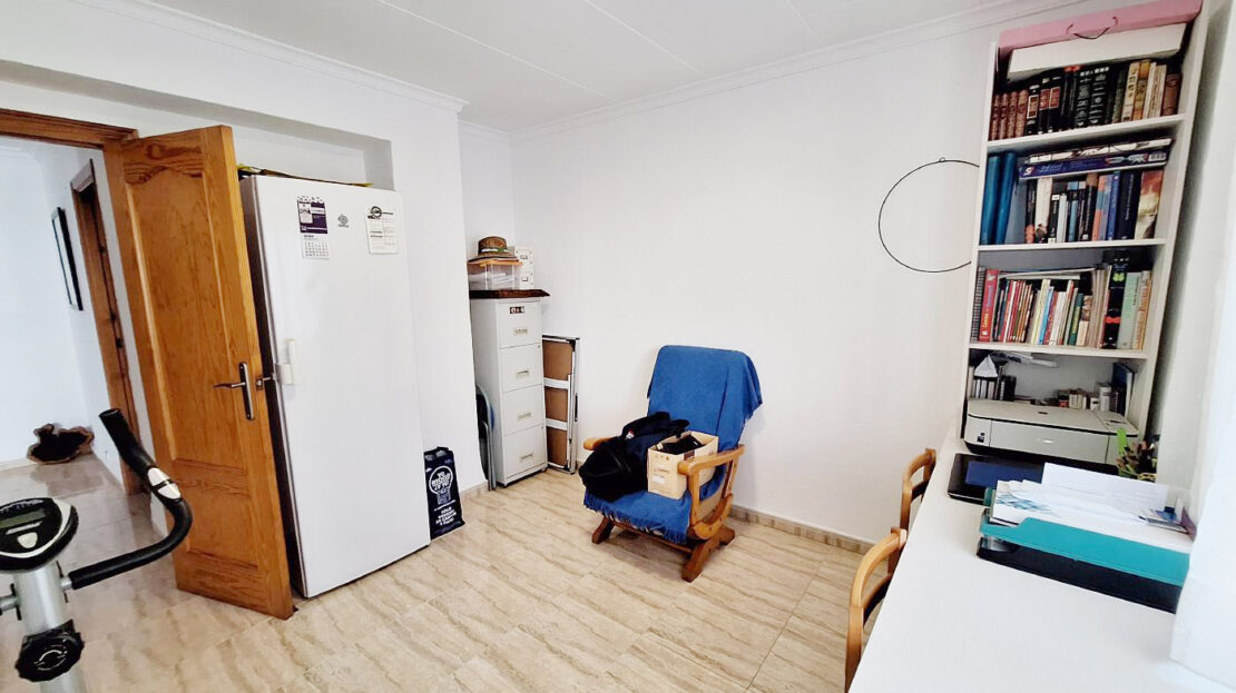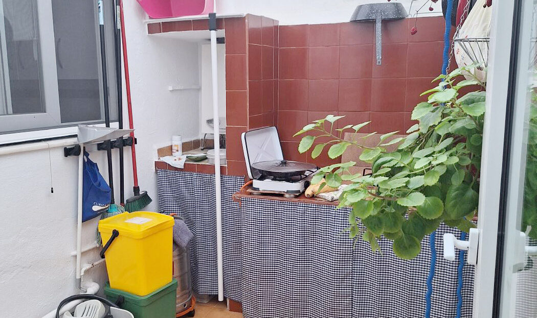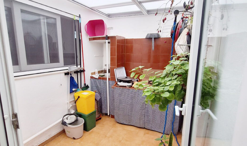 On the ground floor, you will find a double bedroom, currently used as an office, a cosy living-dining room, a spacious fully equipped kitchen and a small patio that brings natural light into the property and offers an additional space for outdoor cooking.