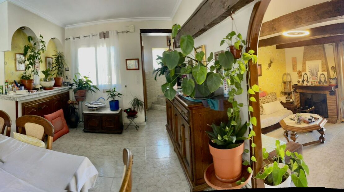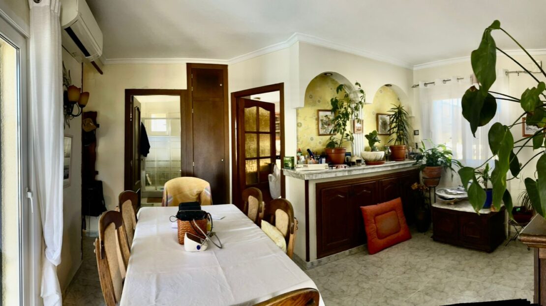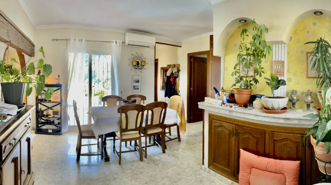 La vivienda dispone de unos 180m2 distribuidos en 2 plantas. En la planta principal encontramos el salón con chimenea, la zona de comedor conectada con el salón pero diferenciando ambos espacios, la amplia cocina independiente y equipada, dos dormitorios, el principal con baño en suite y otro baño completo. Ya en la planta superior encontramos un amplio espacio diáfano en dos alturas que puede ser destinado a distintos usos según necesidades y con acceso a una terraza con increíbles vistas al mar y a la ciudad de Dénia.
