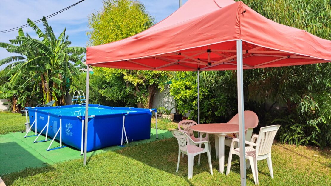 Exterior encantador: Jardín privado, zona de huerto, pérgola ideal para comidas al aire libre, barbacoa, piscina desmontable y un garaje cerrado para un vehículo.