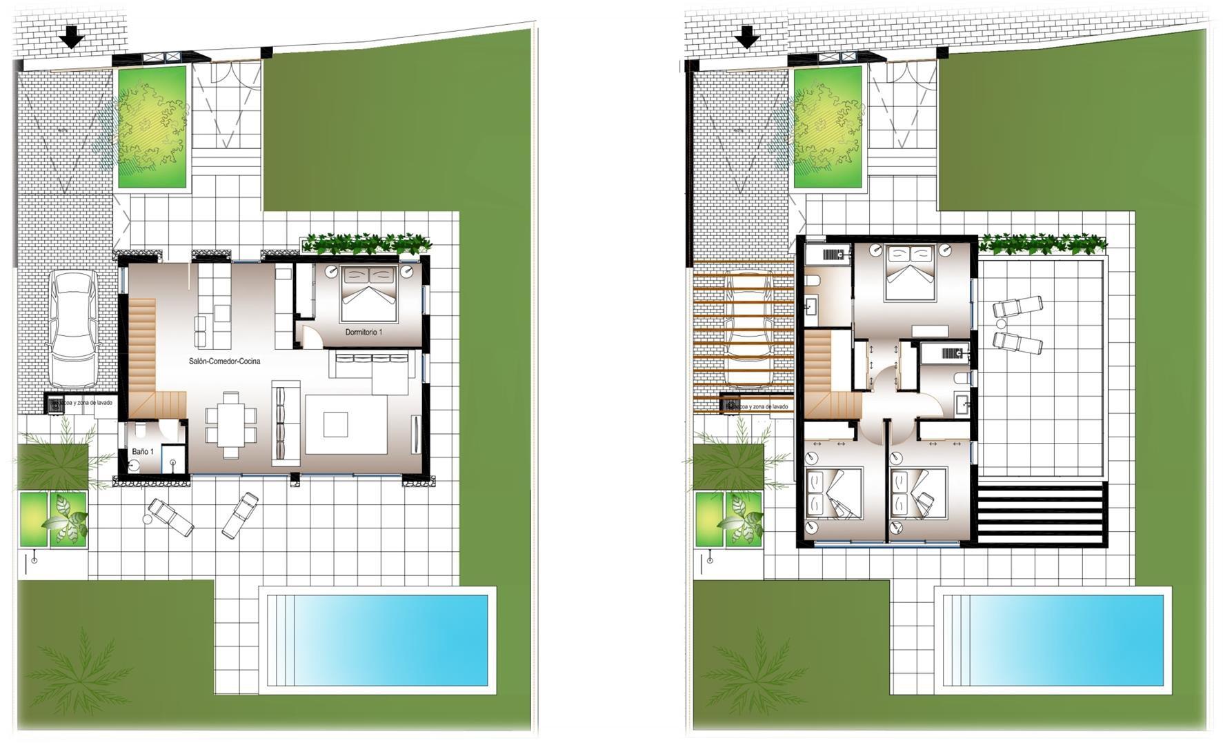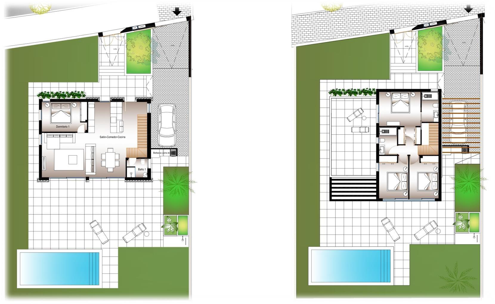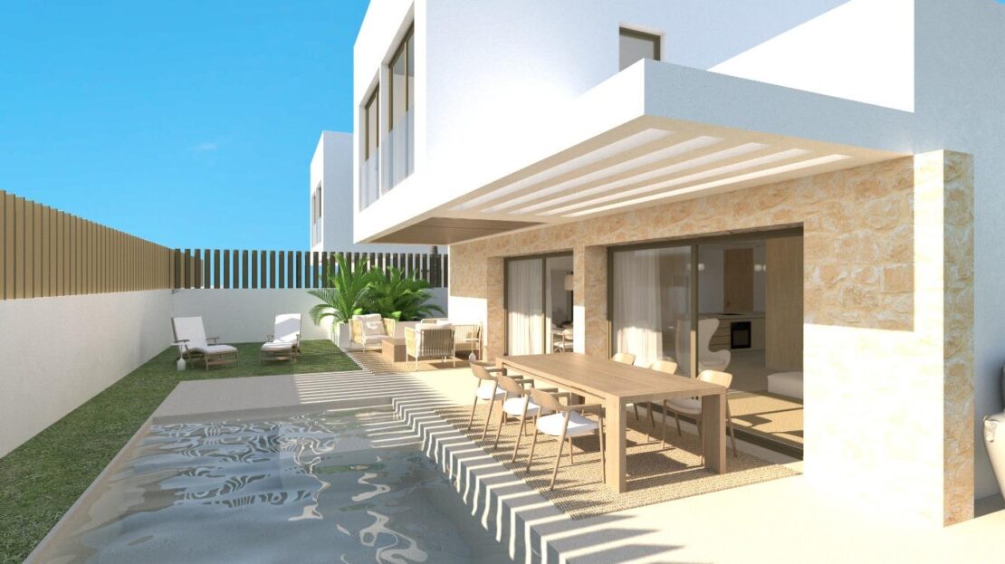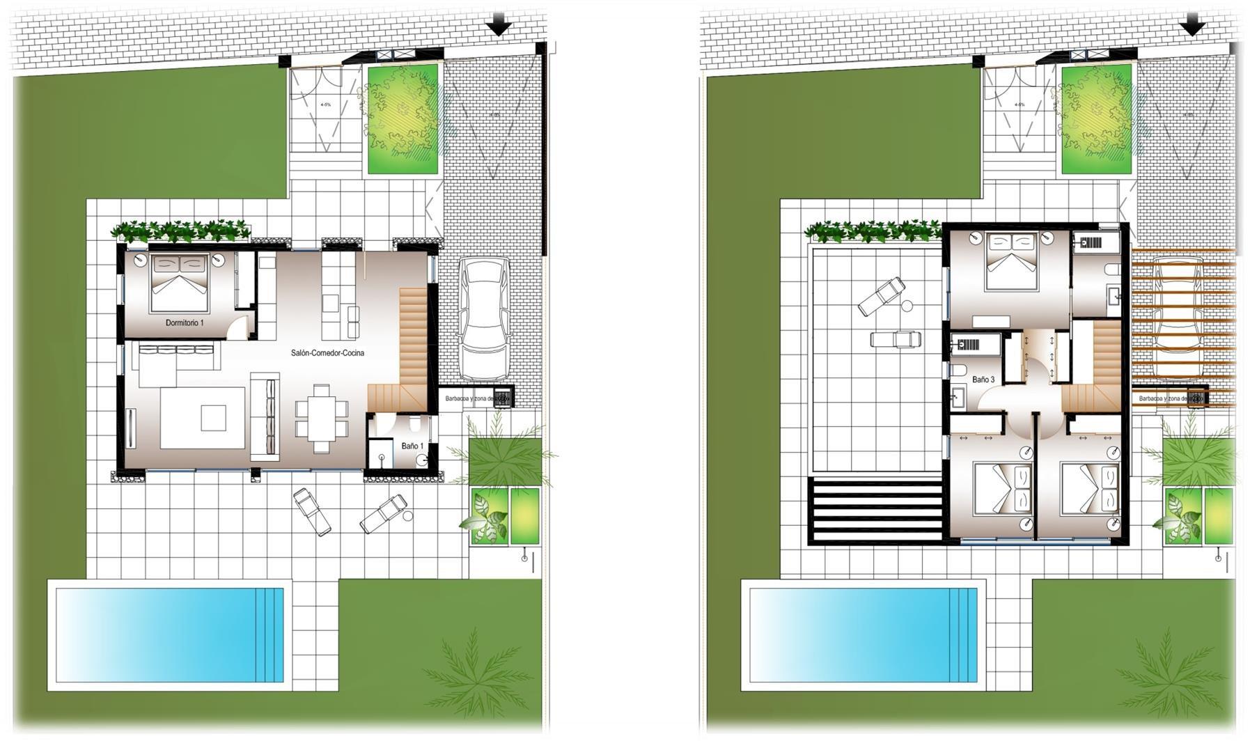 Cada vivienda dispone de 4 habitaciones y 3 baños en total distribuidos en dos plantas, además de su propia parcela independiente , con un diseño que permite disfrutar al máximo del espacio exterior, sin comprometer la intimidad. Las propiedades cuentan con una piscina privada en el exterior, rodeada de amplias zonas de terraza, zona de parking y jardín privado que invitan a disfrutar del clima mediterráneo.