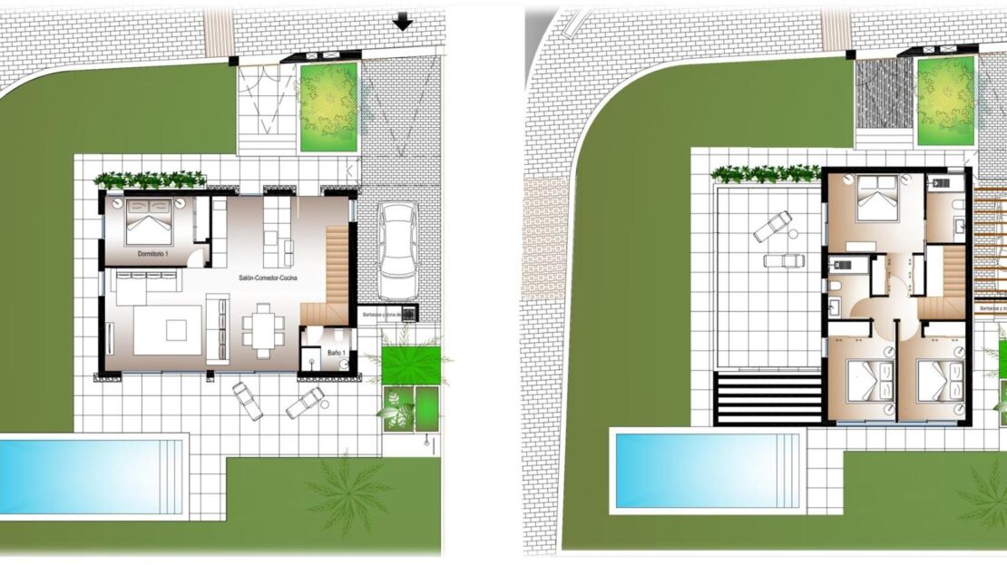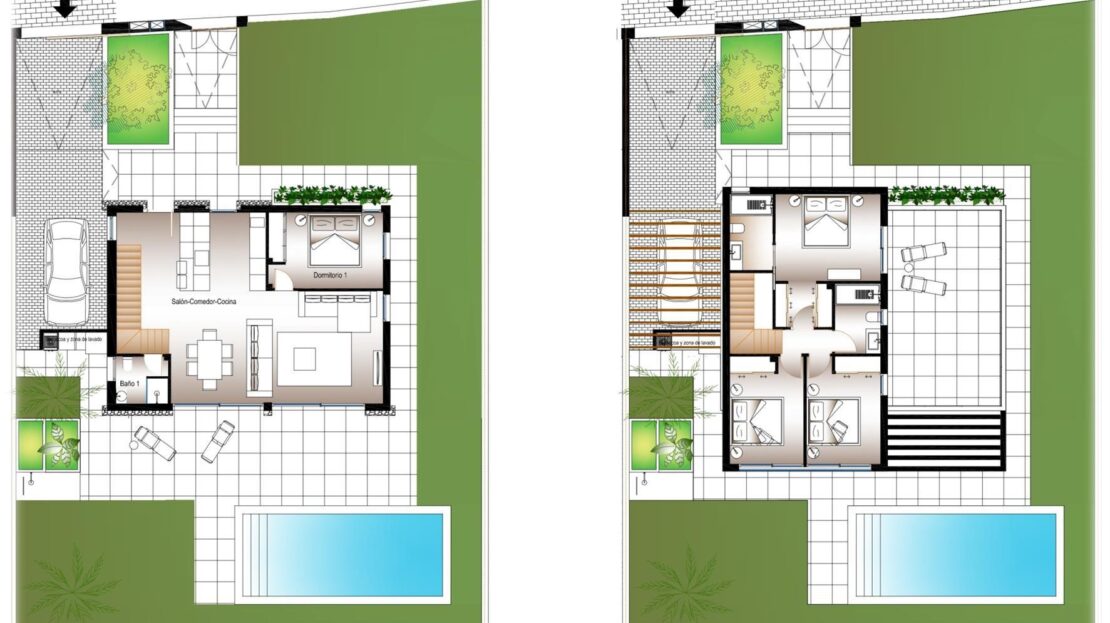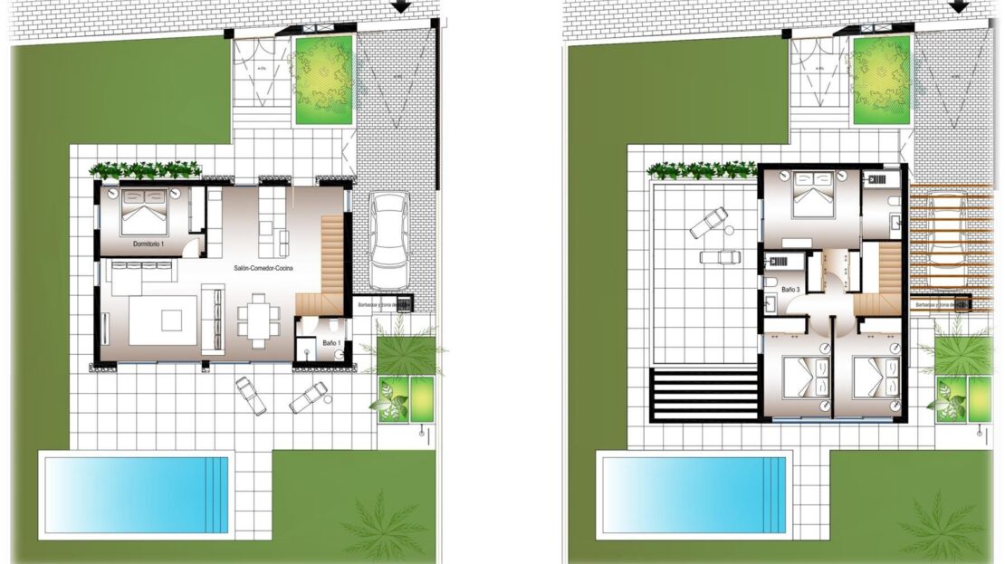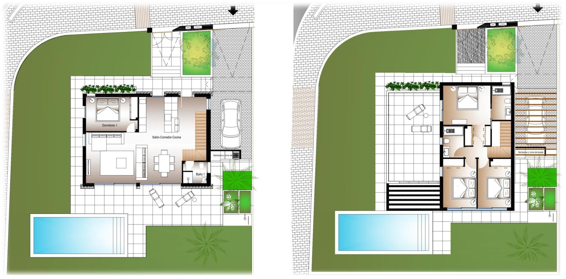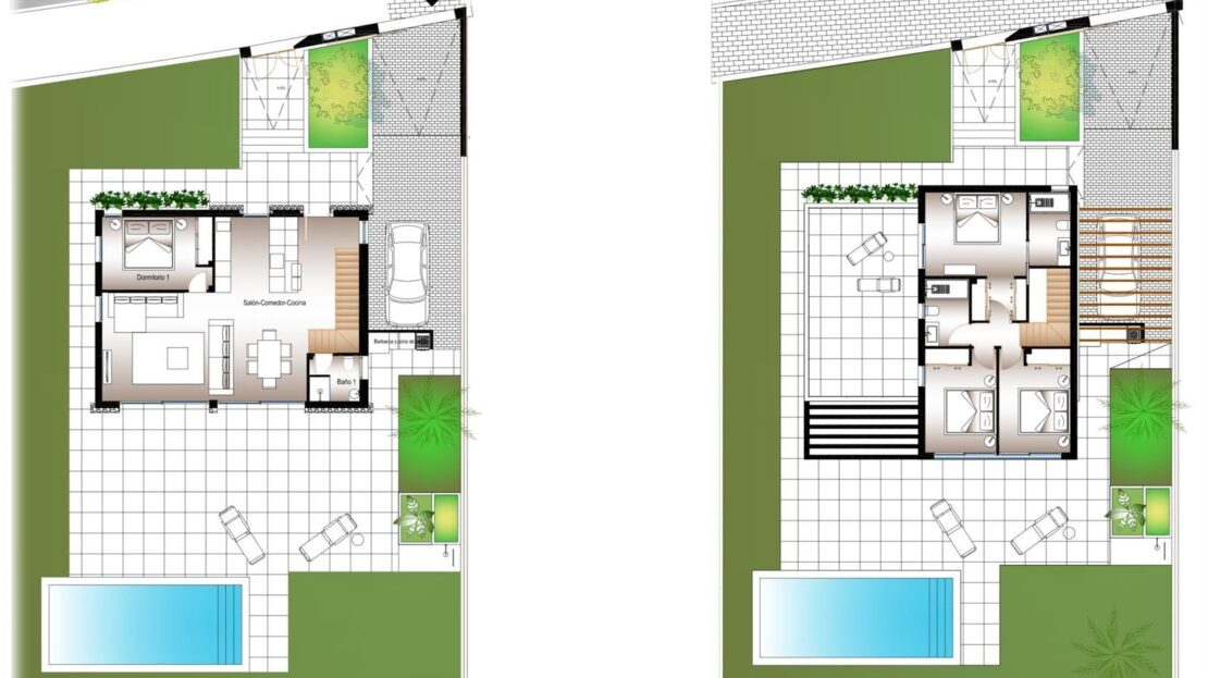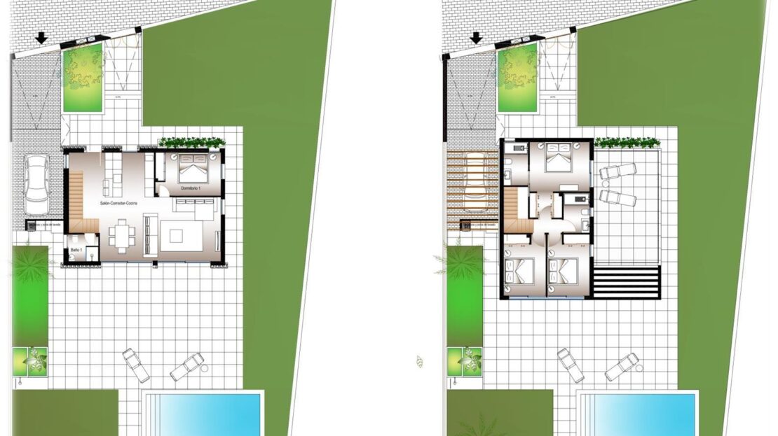 Cada vivienda dispone de 4 habitaciones y 3 baños en total distribuidos en dos plantas, además de su propia parcela independiente , con un diseño que permite disfrutar al máximo del espacio exterior, sin comprometer la intimidad. Las propiedades cuentan con una piscina privada en el exterior, rodeada de amplias zonas de terraza, zona de parking y jardín privado que invitan a disfrutar del clima mediterráneo.