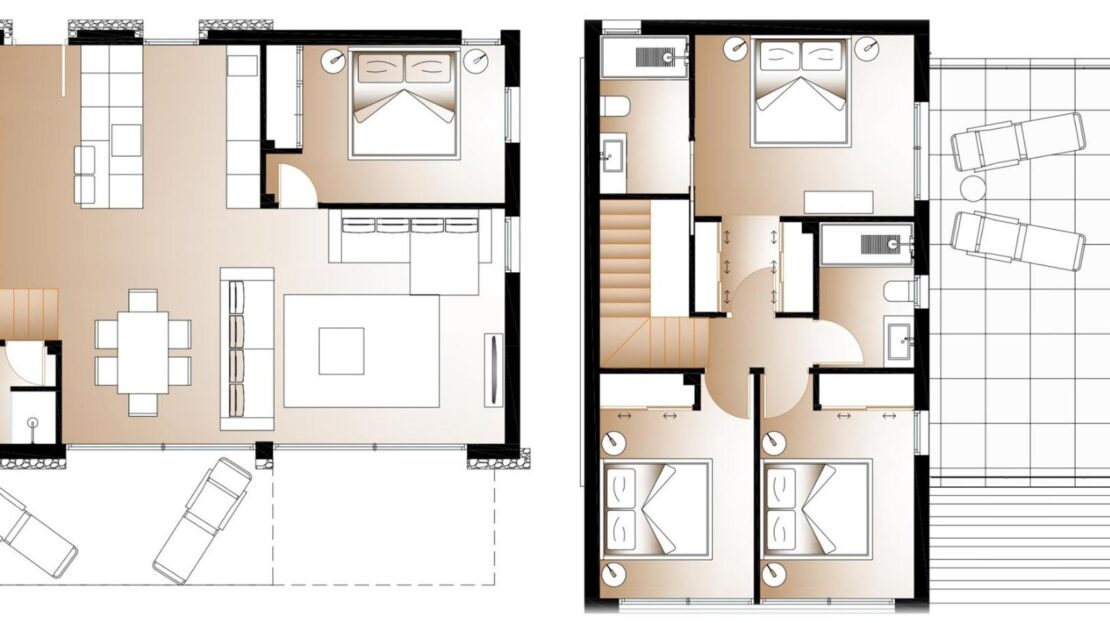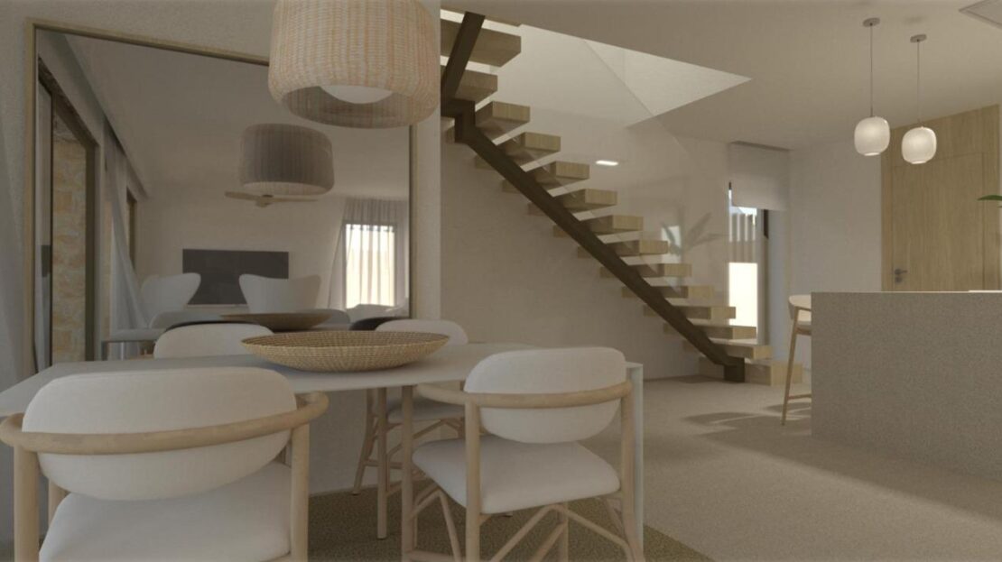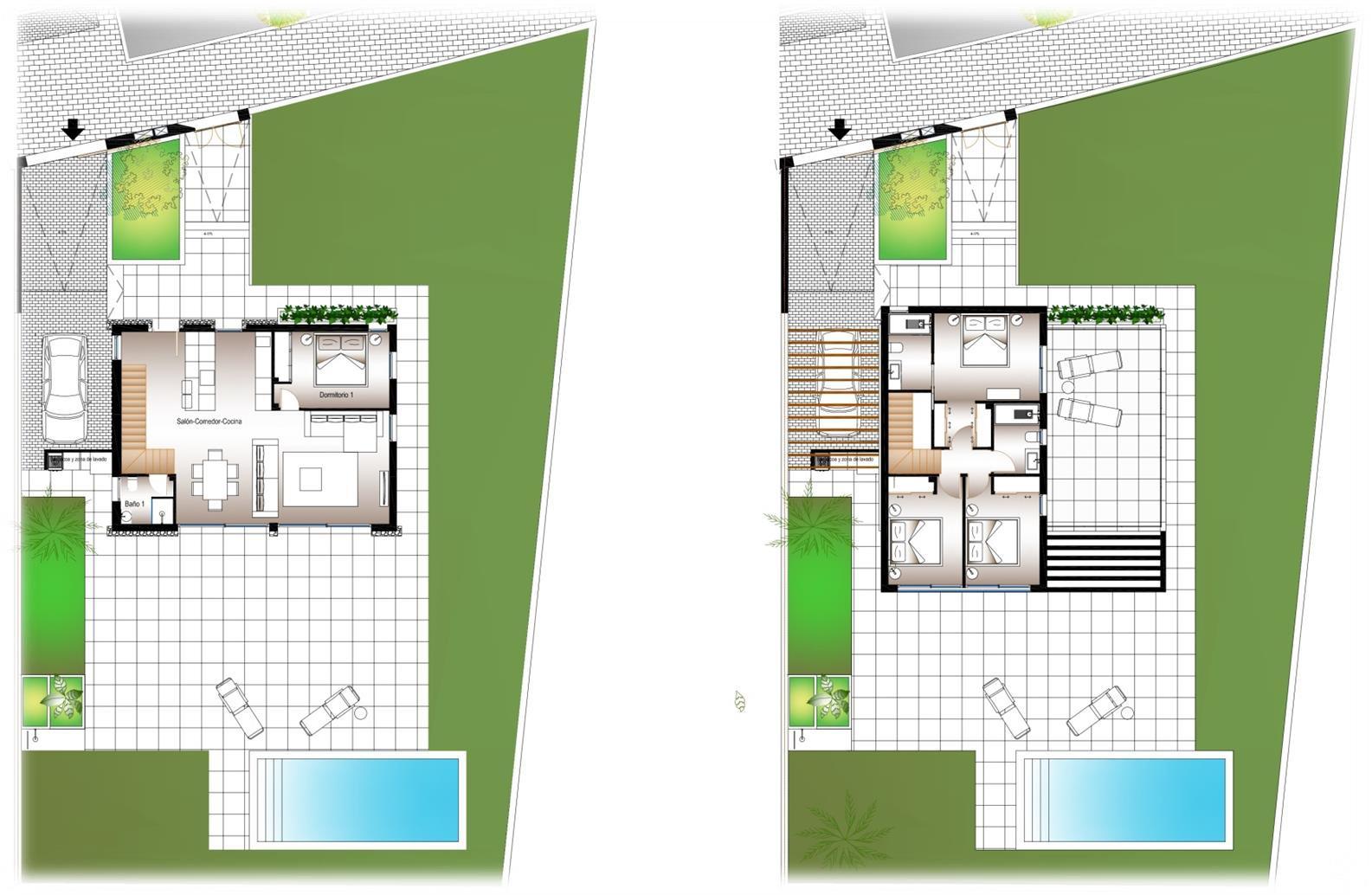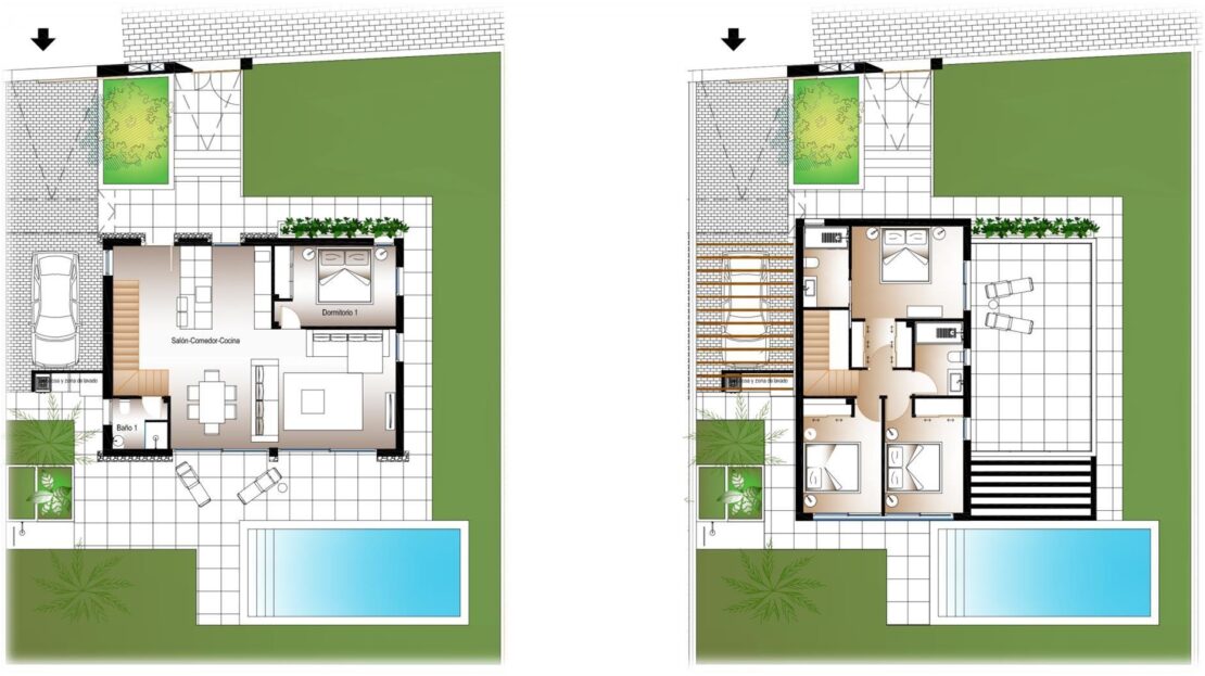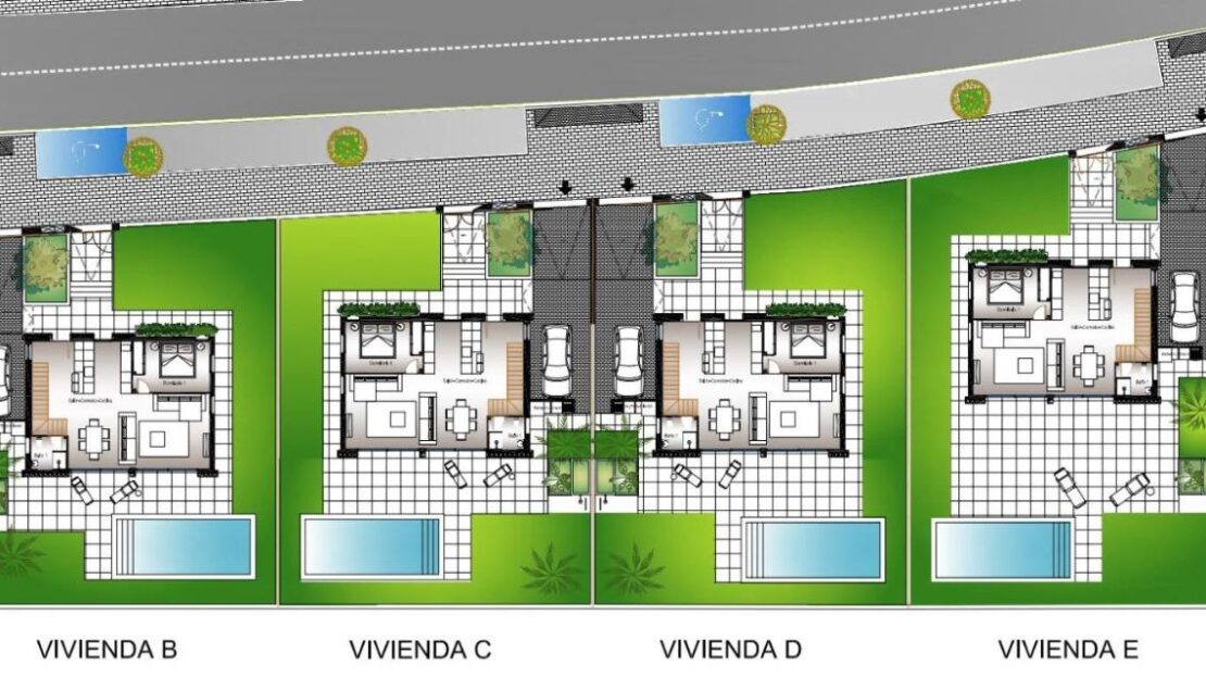 Cada vivienda dispone de 4 habitaciones y 3 baños en total distribuidos en dos plantas, además de su propia parcela independiente , con un diseño que permite disfrutar al máximo del espacio exterior, sin comprometer la intimidad. Las propiedades cuentan con una piscina privada en el exterior, rodeada de amplias zonas de terraza, zona de parking y jardín privado que invitan a disfrutar del clima mediterráneo.