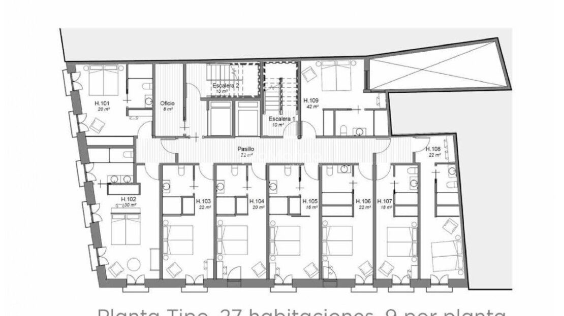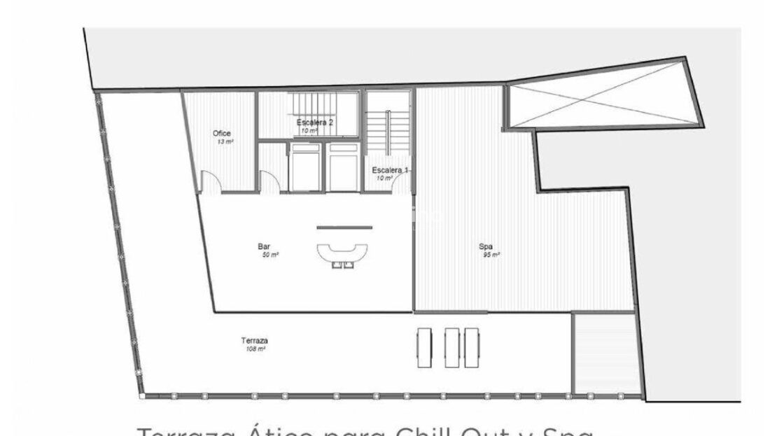 En este proyecto se podrá construir un Hotel o Apartahotel de 4 ó 5 estrellas de 27 habitaciones distribuidas en 3 plantas. En la planta baja se ubicaría un salón multiusos, la recepción, el restaurante comedor, la cocina y almacén, mientras que en la terraza solárium se ha optado por ubicar un ‘sky bar’ y zona chill out.